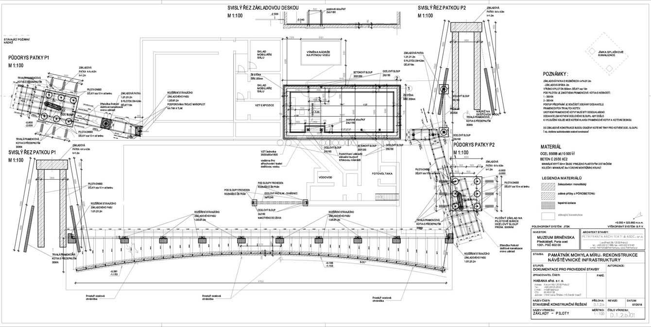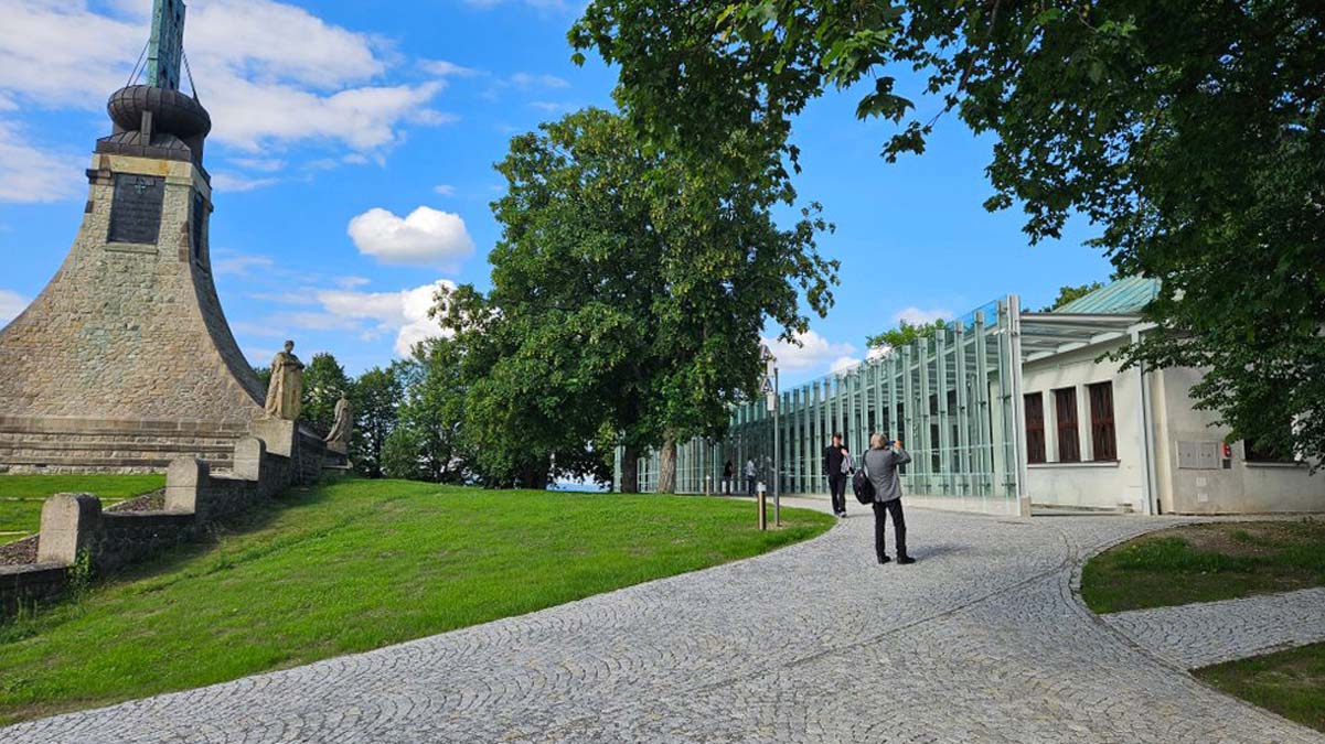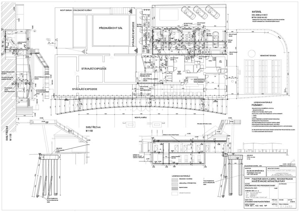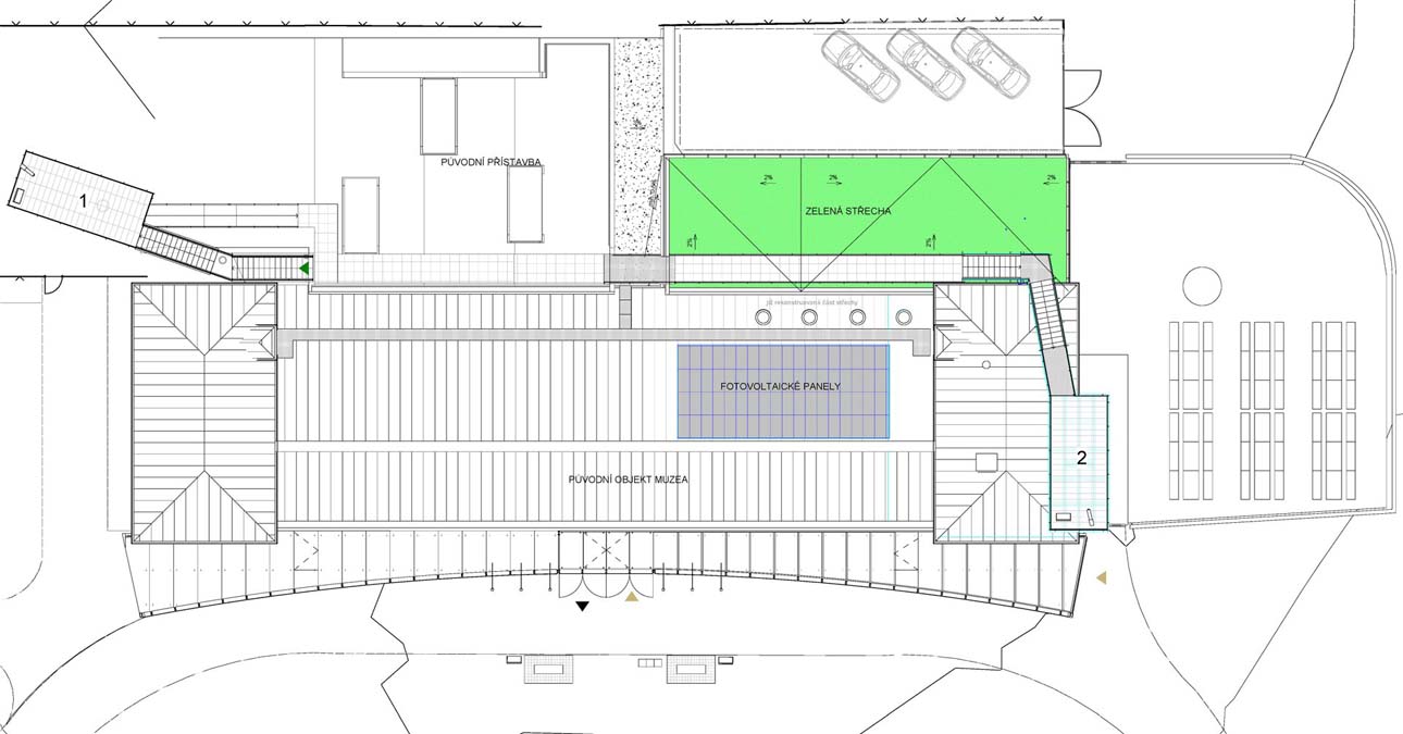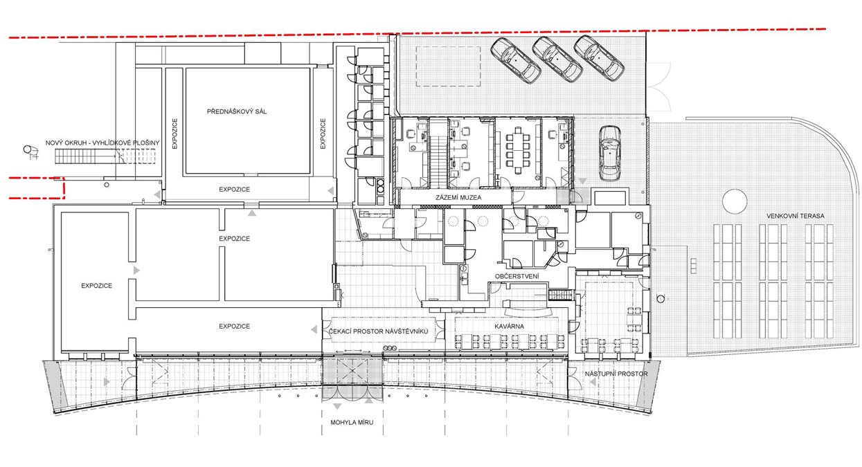 The main idea of the project was to commemorate the first Peace memorial in Europe, which was built out of piety for all fallen soldiers, regardless of nationality or religion. Our primary task was to unite historical and contemporary architecture in a historical and landscape context. The Cairn of Peace, designed in 1907 by architect Josef Fanta, is on the Central List of Cultural Monuments and is also located in the landscape conservation zone of the Austerlitz Battlefield. The principal aim was to sensitively connect the existing museum pavilion with the new infrastructure, i.e. with the museum's facilities – the curators' rooms and offices, depositories and visitors' cafe. The all-glass vestibule wall, that forms an arch in which the Cairn of Peace Memorial is mirrored, seemed ideal. We added two eight-metre high observation platforms – newly designed lookout towers, which Fanta's project originally envisaged, and from which it is possible to oversee the entire Austerlitz Battlefield. At present, the entire surroundings of the Cairn of Peace Memorial have been reconstructed with an oval pattern of paths as well as a new stone paving of the piazzetta in front of the Chapel. The whole area has been illuminated with pylon luminaires. We have also managed to restore the original beds of “Cotoneaster Dammeri” shrubs on the slopes of the chapel, which bear their fruits in the colour of a drop of blood on the anniversary of the battle.