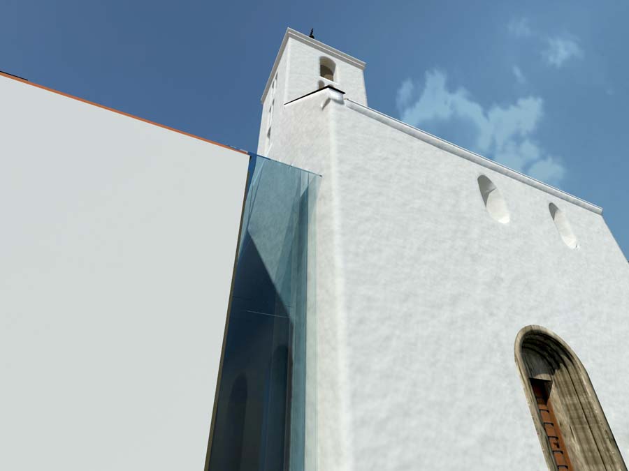 Transparentní princip oddělení skleněnou stěnou je uplatněn v exteriéru i interiéru kostela. V exteriéru výtvarný návrh alteruje vždy novodobé nástavby a přístavby s cílem: nechat vyniknout historickou část kostela. V interiéru se úpravy týkají alterování nepůvodního stropu, nové nášlapné vrstvy podlahy lodi a citlivého nasvětlení tak, aby unikátní středověký cyklus nástěnných maleb vynikl jako nejdůležitější artefakt významného památkově chráněného liturgického prostoru.